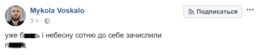 "Уже б***ь и Небесную Сотню к себе зачислили. П***ец", - возмутился блогер.